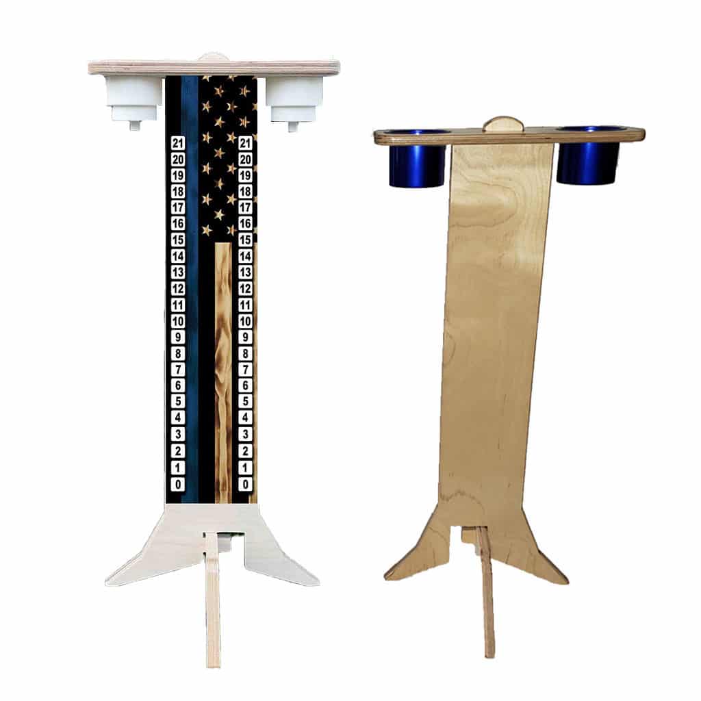Are you looking for a unique gift for your favorite cornhole player? Are you tired of trying to keep score in your head and arguing with other players? Scorpion Cornhole has the answer. These beautifully crafted score keepers not only keep the score but have 2 drink holders in each one to keep your favorite beverages from being knocked over by flying bags. One has the score on it with clip pins included and the other is plain with the drink holders. As and added bonus the tops are notched to hole a tablet or phone for video, Facebook live or using Scoreholio. Plastic cup holders included, colored aluminum available for additional charge
